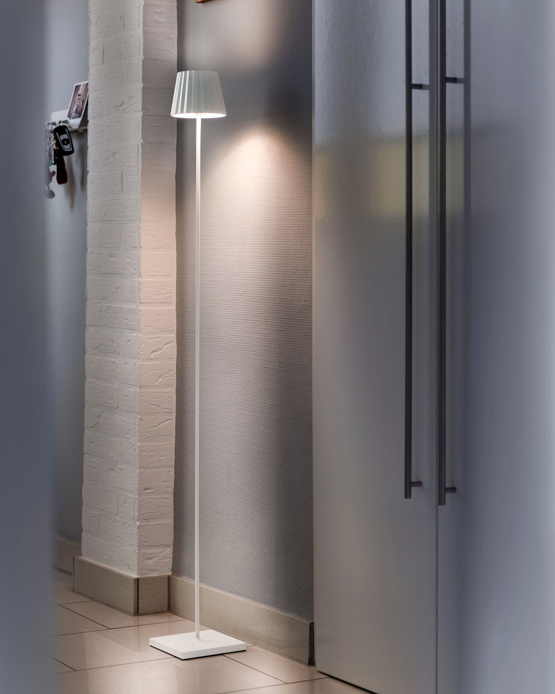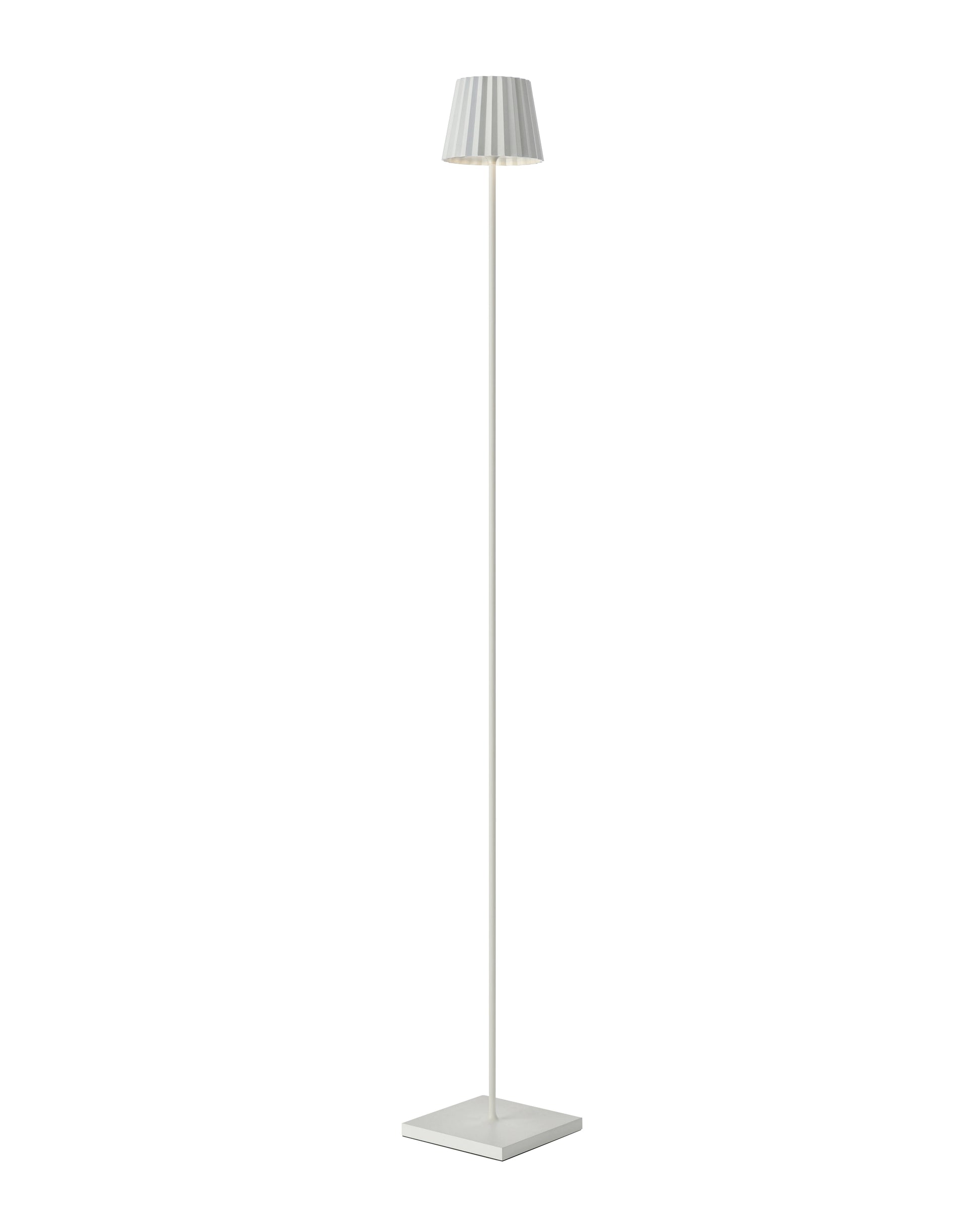 This white standing lamp combines height, tranquility, and light in a single, elegant design. The slender base and distinctive pleated shade give the lamp a refined look, while the soft light creates a peaceful atmosphere on a patio, balcony, or in the garden.